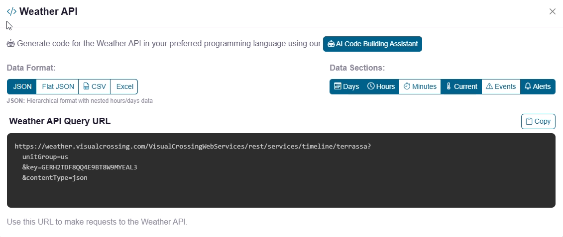 Ahora hacemos clic en Build API Query. Esto generará el código en formato JSON que utilizaremos en nuestra API.