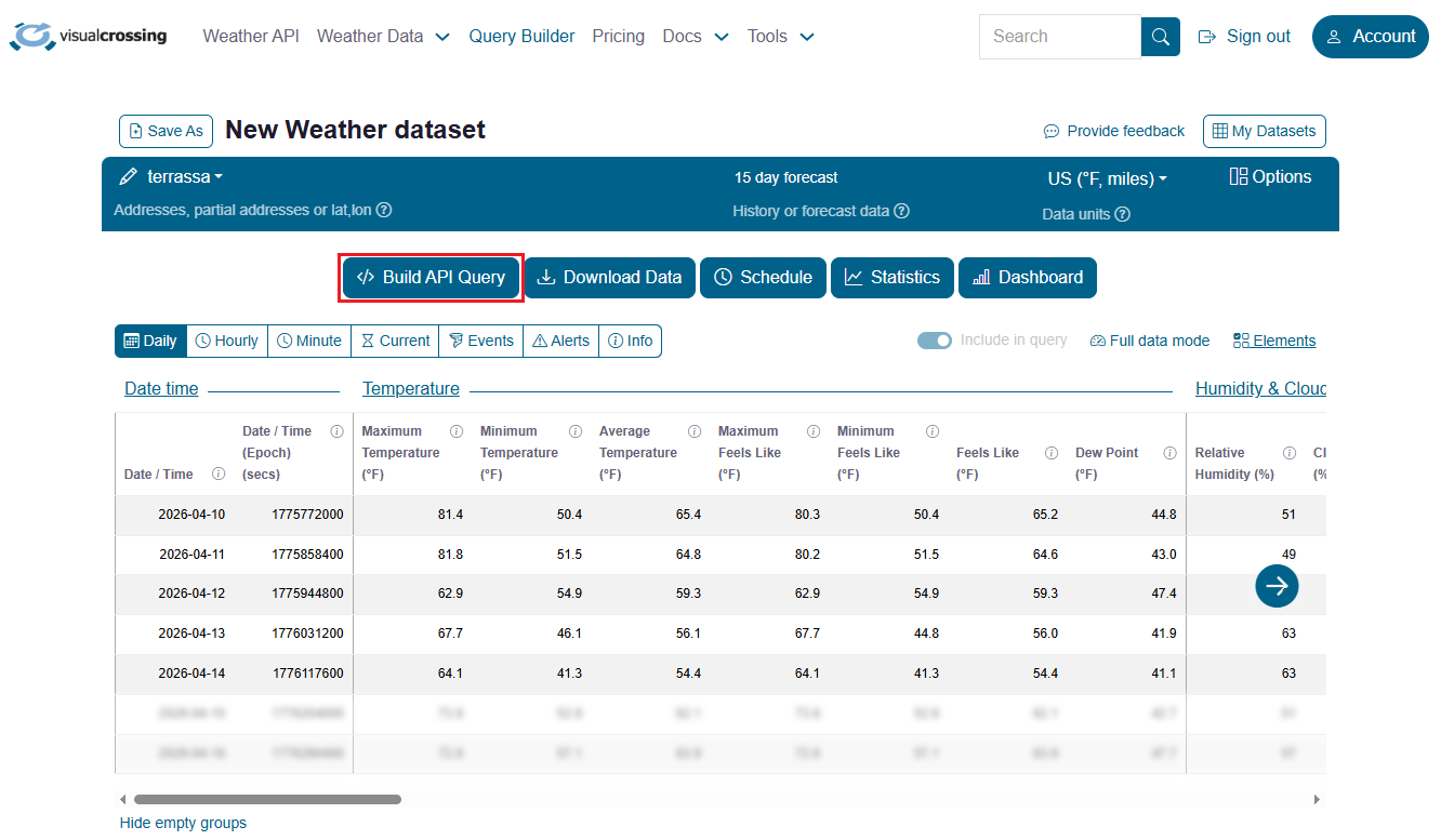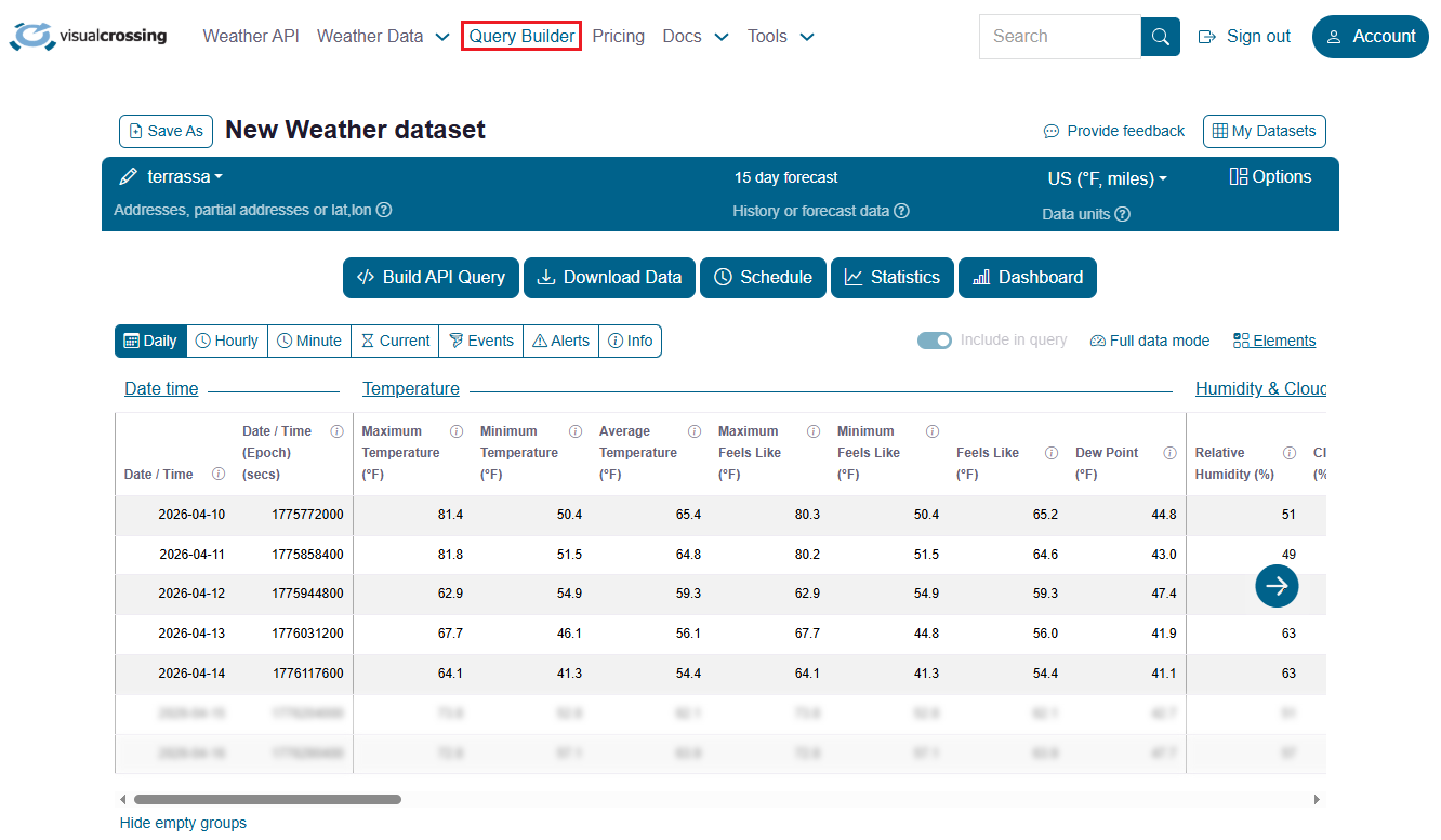Una vez dados de alta en la página web hay que ir a la sección Query Builder donde seleccionaremos la zona de la cual queremos obtener los datos del tiempo.