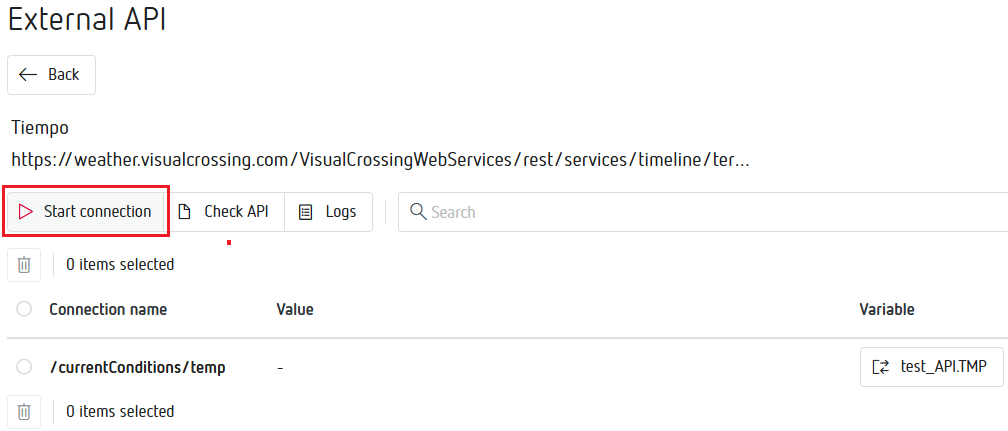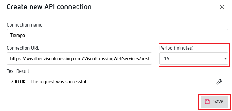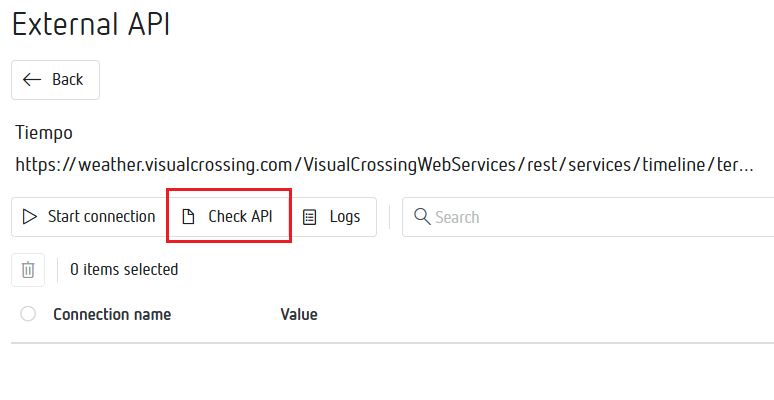 "URL de la conexión": Ponemos el Weather API Query URL que nos devuelve la página y que contiene la información de esta API.