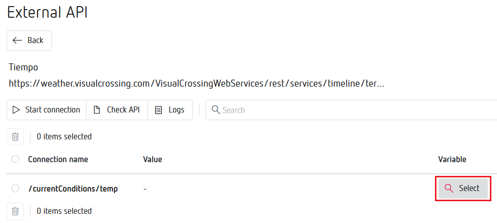 4- Una vez la API está creada hay que seleccionar las variables que se necesiten. Se debe configurar de la siguiente forma: